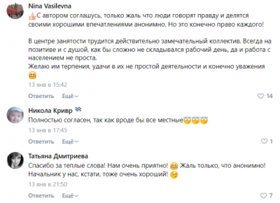 СОГКУ "Центр занятости населения Вяземского района" и отделы в Угранском, Сычёвском и Новодугинском районах работают на благо населения для максимально возможного улучшения ситуации с трудоустройством и, главное, способствуют тому, чтобы каждый человек мог выбрать себе дело по душе! Очень приятно, что люди не только ценят нашу работу, но и оставляют положительные отзывы о ней. Предлагаем вашему вниманию некоторые из них.